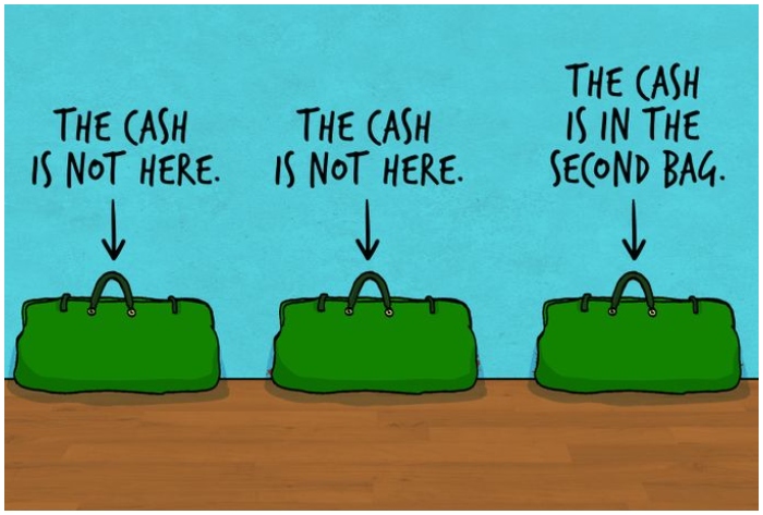 Kimberly found three bags and a note in an old attic. According to the note, just one of the bags can be opened and contains $1,000,000 while the rest are empty. The messages scrawled on each bag are the only hints she has.
