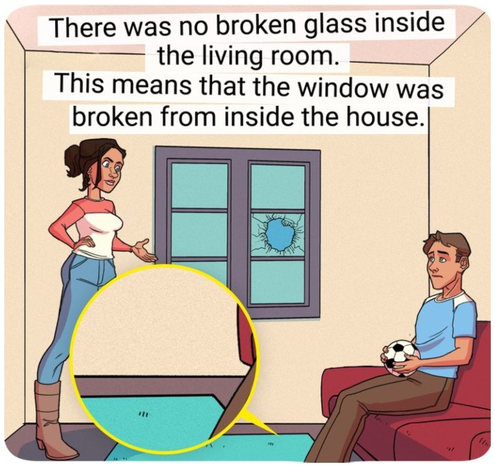 When Ashley got home from work, the window in the living room was broken. She assumed right once that her husband was probably playing soccer indoors once more. But he claimed that while several children were outside playing, one of their balls shattered their glass. Ashley discovered her spouse was lying, but how?