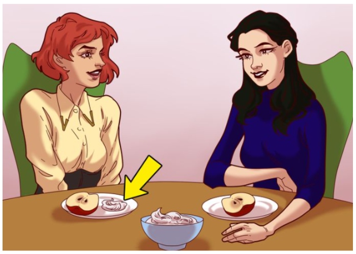 A woman invited her friend home for dinner. She made a meal of mashed potatoes and roast beef. For dessert, she cut an apple in halves and offered her friend one half along with some whipped cream on the side, and put the rest of the cream in a separate bowl. She then ate her piece of the same apple. The friend died of poisoning, but the host survived despite eating from the same apple.