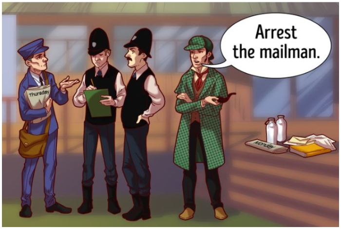 A wealthy man lives alone in a small cottage. Because he was handicapped, he had everything delivered to his cottage. The mailman was delivering a letter on Thursday when he noticed that the front door was ajar. Through the opening, he could see the man’s body lying in a pool of dried blood. On the porch were 2 bottles of milk, Monday’s newspaper, a catalog, flyers, and unopened mail. When Sherlock Holmes got to the cottage, he told the police the killer was the mailman.