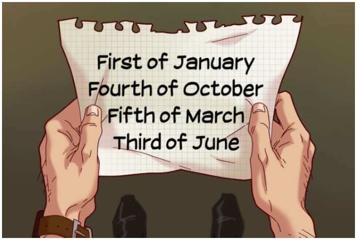 A rich man that lives in a beautiful house on Baker Street, Mr. Ronald Green, has just been kidnapped, and Sherlock Holmes has been appointed to the case. He finds a note at the crime scene written by Mr. Green. It read: “First of January, Fourth of October, Fifth of March, Third of June.” Sherlock knew that, somehow, the killer’s name was hidden in the note. The suspects were as follows: