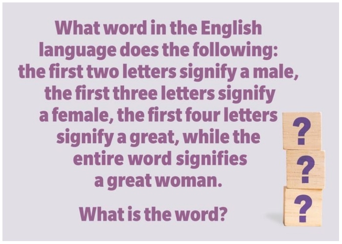 What English term accomplishes the following: The word denotes a great lady, while the first two letters denote a man, the first three letters denote a woman, and the first four letters denote a great individual. Which word is that?