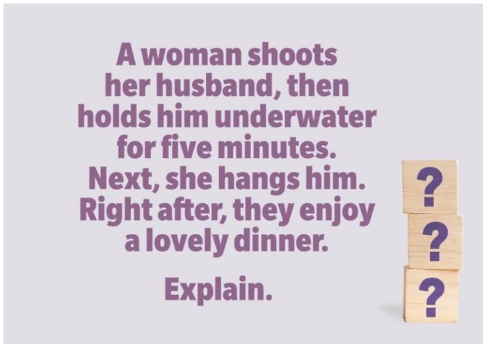 A husband is shot by his wife, who then submerges him for five minutes. She hangs him next. They immediately had a great meal following that. Explain. This problem intends to startle you and knock you off balance. However, focus on the first verb, “shoots.”