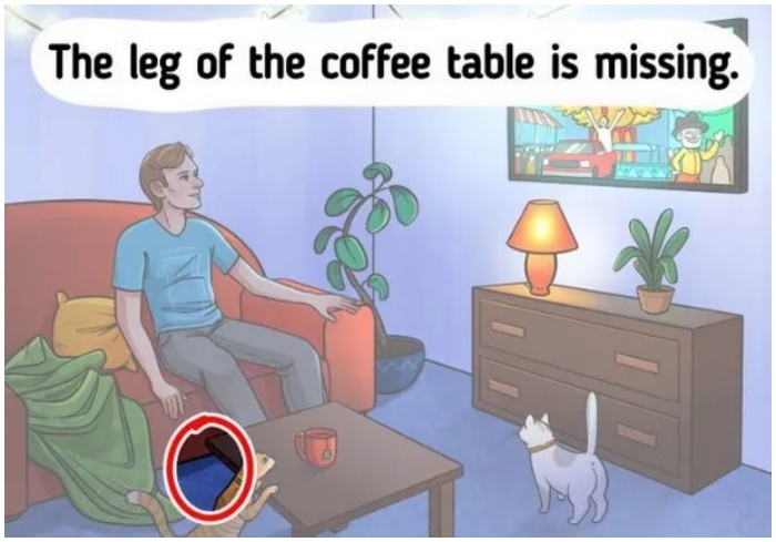Can you spot it? Take a closer look: the coffee table, a central fixture in the living room, precariously balances on just three legs! Once you notice it, the omission is startlingly obvious. In a real-life scenario, this tri-legged table would surely be a disaster waiting to happen, ready to send a hot cup of tea flying in all directions! So, are you among the select few who cracked the puzzle in a flash? If so, give yourself a pat on the back – your keen observation skills and sharp intellect are truly commendable!