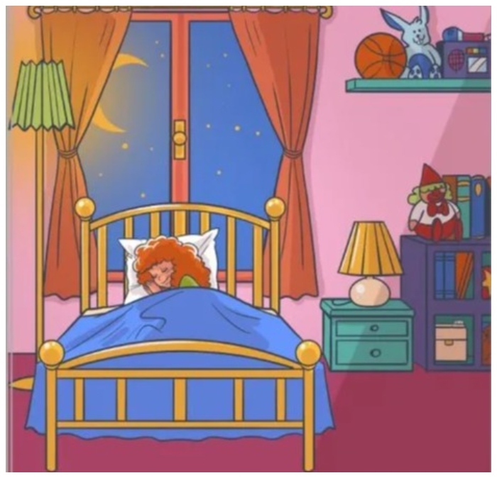 Hot Tip Alert: If you’re finding this exercise as challenging as a Rubik’s Cube on a rollercoaster, focus your eyes on the shelves brimming with toys. Don’t be misled by the moonlight or the serenity of the sleeping girl. Scroll down to the end to see the answer