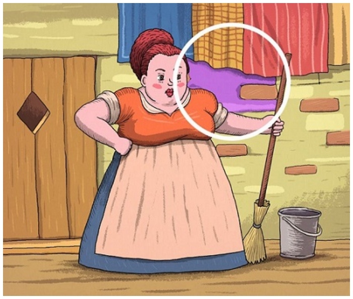 Take a close look at this image featuring a cleaning lady armed with a broom. In the midst of this mind-bending illusion, she seems to be bothered by a cat surreptitiously hiding in her surroundings. With her broom and bucket nearby, a rustic wooden door, and some garments set as the backdrop, somewhere within this vivid scene, a cat is lurking, deftly camouflaged. Scroll down to the end to see the answer