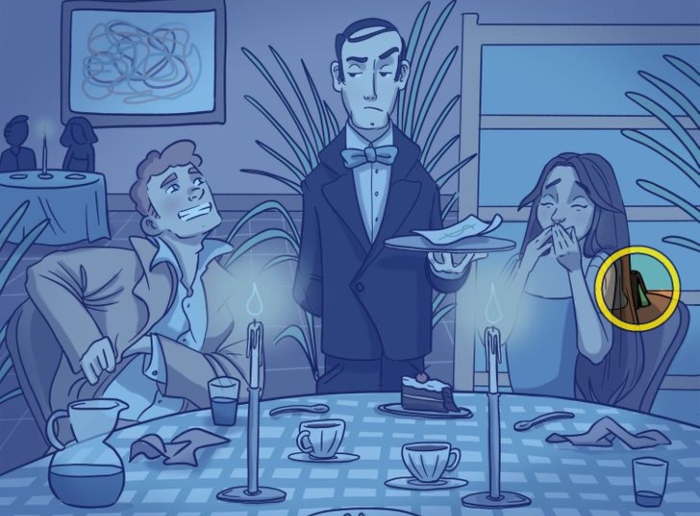 This optical illusion unfolds a story within a restaurant, where a man and a woman are enjoying their date. As the bill arrives, panic sets in—the man’s wallet is missing! The waiter’s suspicious glance and the woman’s worried expression add to the tension. Yet, the wallet is hidden somewhere inside the restaurant.