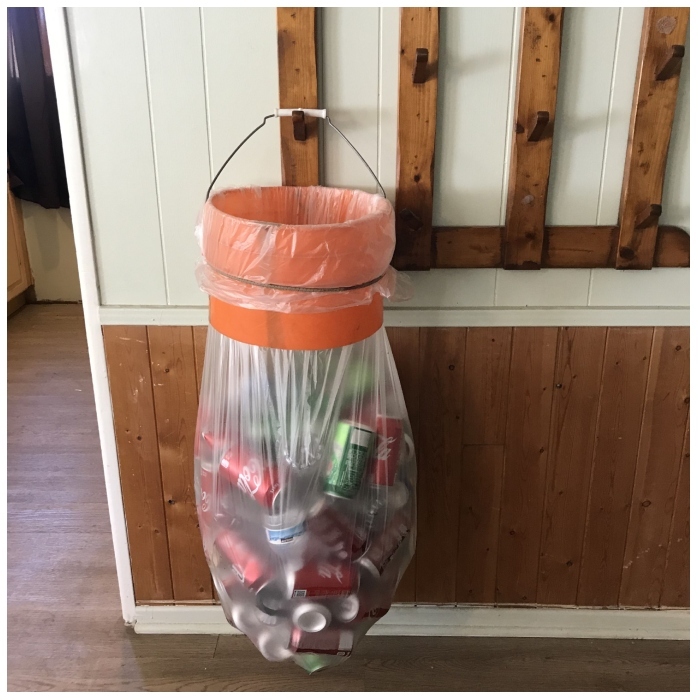 What You Do: Cut a hole in the center of the lid with the drill and the drill bit. The hole should be big enough to fit the bag through it. Put the bag inside the lid and pull it through the hole. Secure the bag with a knot or a rubber band. Mark where you want to hang the lid on the wall with the marker. Drill a hole in the wall where you marked and insert the hook. Hang your DIY “Bucket” Recycling Bin on the hook and enjoy!