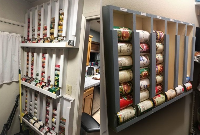 Each row comfortably fits cans of varying sizes, ensuring they roll forward as one is removed—akin to an automated grocery shelf. Not only does this storage solution keep your cans orderly, but it also adds a touch of rustic charm to your pantry’s decor.