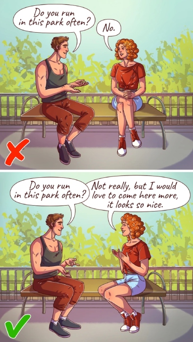 When approaching someone you’re interested in, the difference between a short, disinterested response and an engaged conversation can be pivotal. In the first image, the woman’s brief reply and body language, not facing the man, suggest a lack of interest or comfort in the interaction.