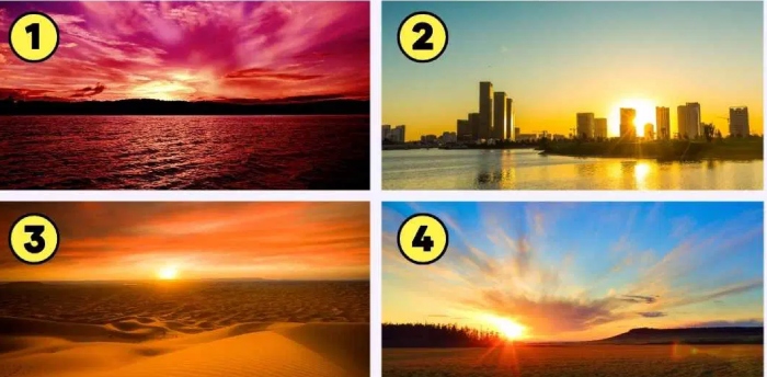 On the other hand, if the raw, vivid beauty of Sunset 3, a desert dusk, resonates with you, it mirrors your fearless, exploratory nature. Unbound by conventions, you’re adaptable and capable, facing challenges head-on with thoughtful courage when it involves those dear to you. Alternatively, if Sunset 4, a serene sunset over lush plains, beckons you, it reflects your ever-optimistic personality. The ability to see the good in the worst, a comfortable life with self-deprecating humor, and creative problem-solving define you. Your vibrant cheerfulness makes you a magnetic presence, lighting up the world around you.