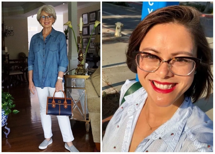Glasses with thin wire rims tend to make you look older. Rather than investing in metal frames, choose colorful plastic ones. The black or brown color scheme is often chosen by women because they believe it is a “safe” choice. As we age, black can become harsh on our faces and requires a lot of makeup to make it look good.