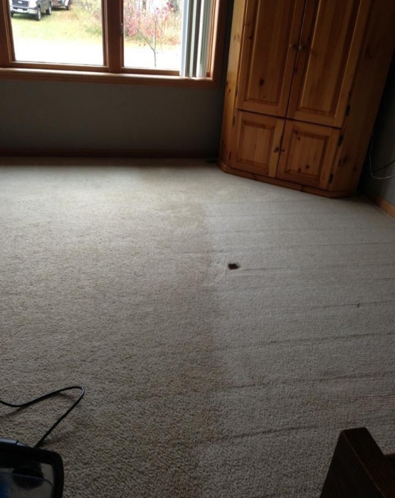 After the carpet is completely dry, take a hard-bristled brush and comb through the hairs to even the carpet and fluff it up. You can also remove carpet dents with a towel. Place a damp dish towel or cloth directly over the dent. Set iron on medium heat or on the steam setting, and run it over the towel for about thirty seconds to a minute—but don’t let the iron touch the carpet directly, as it could burn. Finally, vacuum over the spot or fluff it up to make the fibers uniform and high.