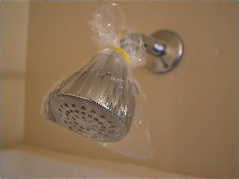 There is a simple hack to get rid of all the mineral deposits and other grime from your shower head by simply soaking it overnight in clear white vinegar. Rinse and repeat this process as many times as it is needed. You can also remove it to clean it. Remove the showerhead by twisting it counterclockwise. If you are having difficulties twisting it, try wrapping an old rag around the connecting nut and then twisting it with a wrench. Put the showerhead into a pot. Consider using a smaller container that just about fits the showerhead; this way, you will use less vinegar. Fill the pot with enough white vinegar to cover the showerhead. The acids in the vinegar will help dissolve the white mineral deposits on the showerhead.
