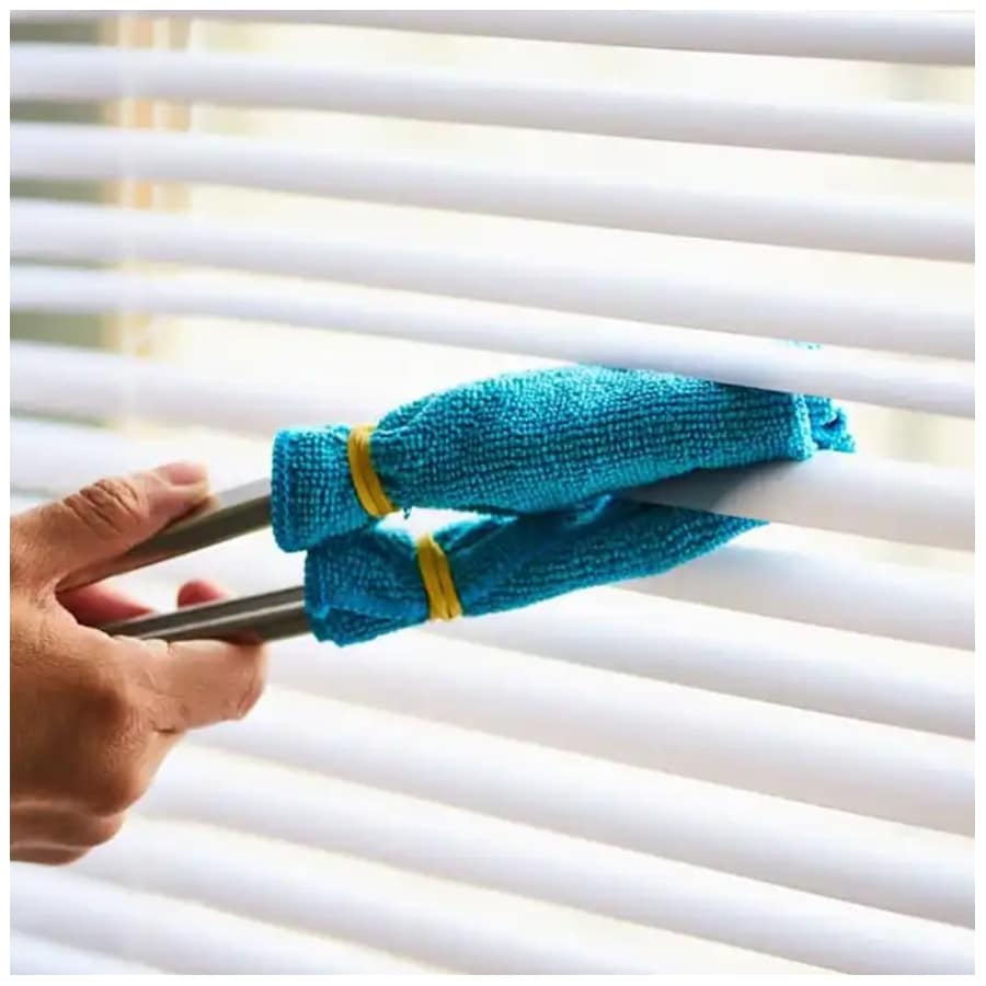 Simply grab your kitchen tongs and cover each side with a small microfiber towel and brush the dust away without major hassle! If you have standard window shades, start by lowering them completely. Wood and faux-wood blinds can be entirely closed; vinyl and aluminum blinds should be slanted downward but not totally closed because the slats sometimes overlap. To stabilize vertical blinds, grip the bottom of the blind in one hand. Starting at the top and working your way down, wipe the blinds with a microfiber cloth. If you wipe downward, they can come unhooked. You can also eliminate dust with a soft dusting brush attachment and a low-suction setting on your vacuum cleaner. The procedure is the same for horizontal blinds, only you clean from side to side.