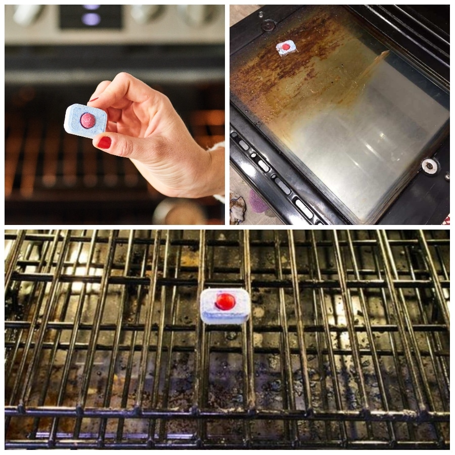 First, make sure you put rubber gloves on to protect your hands from harmful chemicals since dishwasher tablets contain bleach. Then, soak the tablet in warm water and scrub away the dirt. Rinse with a wet cloth. Dishwasher tablets are powerful dishwasher detergents that promise to cut through difficult grease and leave your dishes shining. It is only natural that those powerful cleaning solutions also remove oven oil and food stains. Especially considering the tablets claim to remove baked-on food, yet oven stains are unquestionably baked-on. Plus, the abrasive surface of the firm powder tablets helps scrub away those stuck-on spots while being soft enough not to scratch the oven glass.