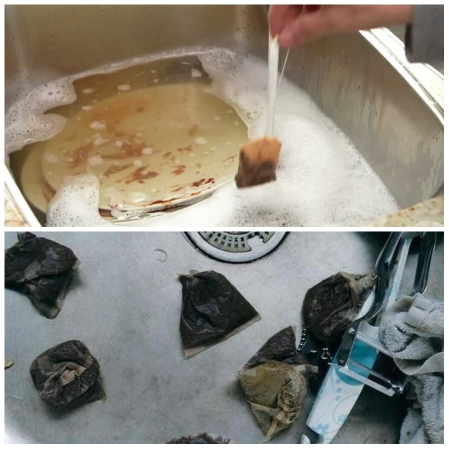 Submerge the dirty dishes in hot water in the sink and add about a dozen tea bags. Be amazed at how easily the grease comes off. Don’t dump the tea bag in the trash the next time you drink a cup of tea. Put the tea bag in the sink with some hot water if you have anything in the sink, like that morning’s sticky oatmeal bowl or a tough-to-clean pan from dinner. Allow time for it to soak. The tea should release any crusted filth, allowing you to wipe clean with little to no washing and less dish soap in the morning.