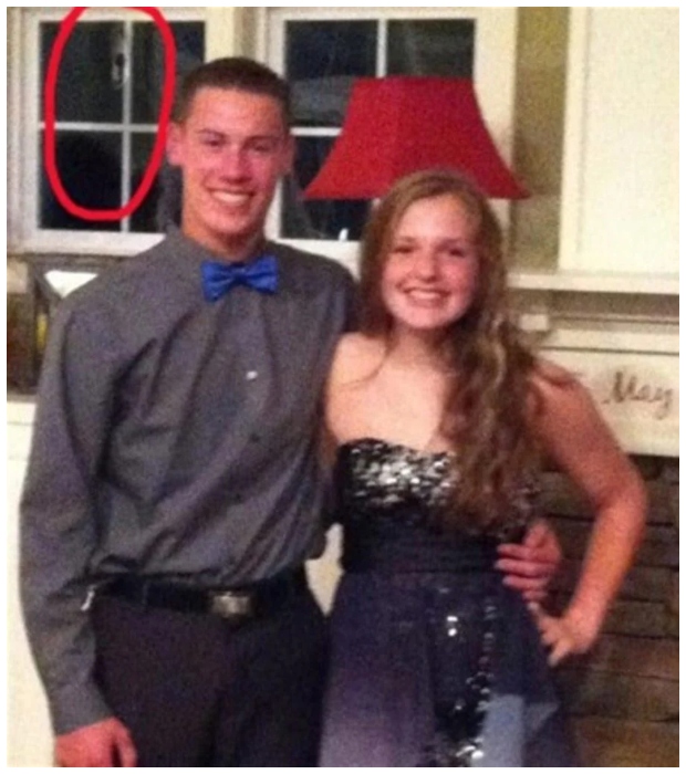 A young man and his date, dressed to the nines, ready for a memorable night at the homecoming dance. A photo to capture the moment is photobombed by an uninvited guest, a spectral figure shrouded in mystery. Was it a trick of light or something far more eerie?