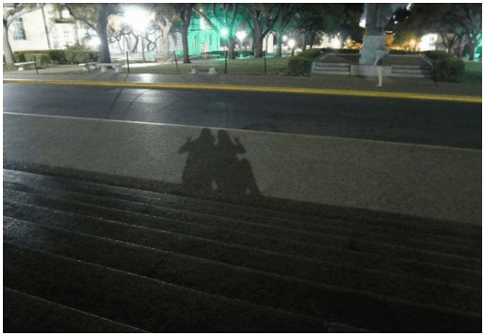 The road may have appeared empty, but the photo revealed something different. Alongside the shadows of peace signs, ghostly figures are echoing the same gesture.