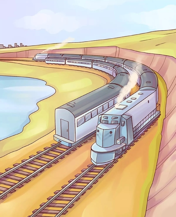 Envision a compelling scene where two trains pass each other on a single railroad track. Flanked by a precipitous cliff on one side and a peaceful pond on the other, it’s a vivid illustration of engineering prowess and mechanical harmony.