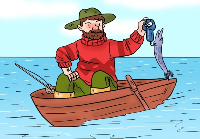 Picture a fisherman alone in the middle of the sea, joy emanating from his face as he holds up his latest catch. The sparkling water reflects the sky, and the entire scene exudes a sense of freedom and achievement.