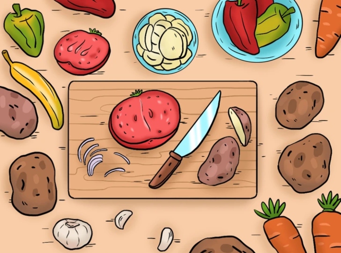 Envision a home kitchen full of life and culinary aspirations. The table is laden with a variety of fresh ingredients, all surrounding a chopping board that serves as the centerpiece for a delicious stew in the making.