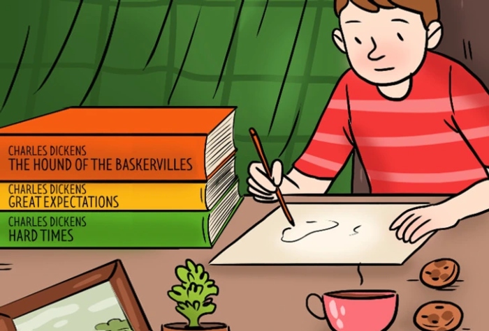 Envision a young boy engrossed in his drawing, a table full of books beside him. It’s an intimate portrait of creativity and learning, capturing a moment when imagination and education collide.