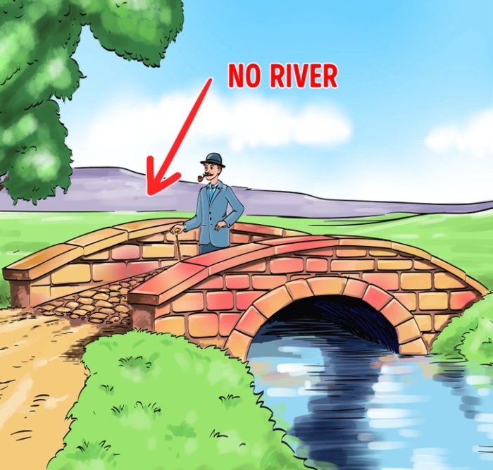 The gentle babbling of the water running underneath the bridge completes this idyllic scene. You can almost hear the chirping of the birds and feel the cool breeze on your face. However, take a second look, and you’ll notice a bizarre detail that disrupts the tranquil tableau. Scroll down to the end to see the answer