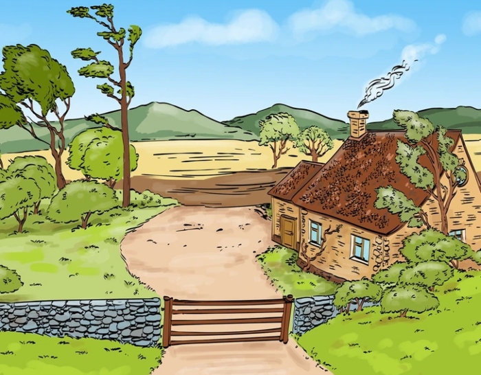 Imagine yourself gazing upon a picturesque country house, ensconced in the verdant embrace of lush trees and bushes. The scene radiates rustic tranquility, further accentuated by a quaint gate and stone fence that seem to whisper stories of yesteryears. Smoke lazily curls up from the chimney, giving you the comforting thought of a cozy fire crackling inside.