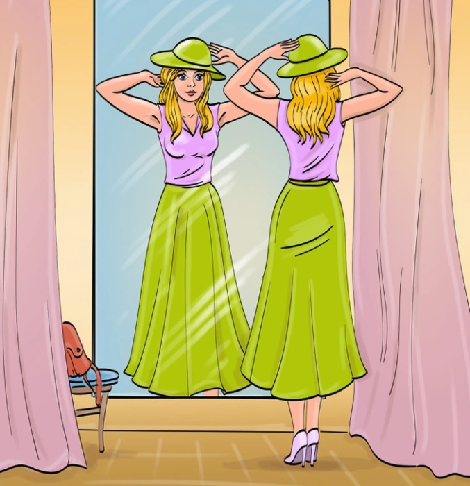 She’s adjusting her hat in the mirror, seemingly satisfied with her fashion choices. The colors are vibrant, the fabrics look luxurious, and the whole setting exudes a mood of cheerful self-expression. However, if you look closely, you’ll see an unsettling detail, can you recognize it? Scroll down to the end to see the answer
