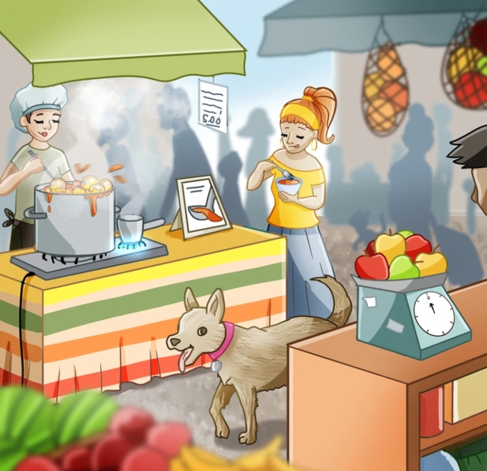 Picture yourself immersed in a bustling marketplace, where your senses are immediately overwhelmed by a delightful medley of aromas. Fresh fruits, hot soup, and an array of other delectable foods pervade the air. A woman seems to be thoroughly enjoying her bowl of soup at one of the stalls, while a curious dog meanders through the crowd, taking in the scents and sights.