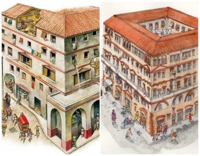 Rome was populated mainly by those at the lower end of the income scale. They all needed somewhere to call home, as they were part of the first city with over 1,000,000 inhabitants. Solution? High rises. These apartment buildings were known as the insula, meaning “island,” and could reach 100 feet in height.