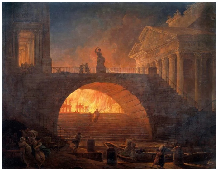 Fires could be contained by destroying nearby buildings and firefighters, called Vigiles, working with water buckets to extinguish flames. Romans used hot coals to cook food in the interior, but that didn’t help the fires. The Great Fire of Rome burned six days, was rekindled for three more days, and destroyed two-thirds of Rome.